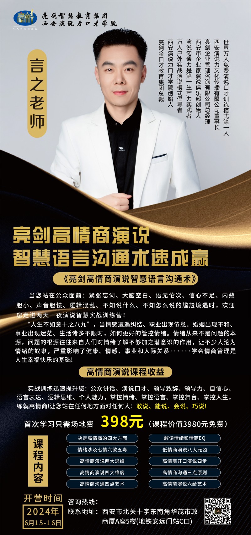 训练营|亮剑口才魅力演说实战速成营 学习收益: 跟亮剑学演说、人人都是演讲家 秒杀价:398.00¥1980.00 活动时间:2024-06-15 09:00 ~ 2024-06-16 18:00 活动地址:亮剑口才(西安曲江校区) 已报名:3261 立即报名