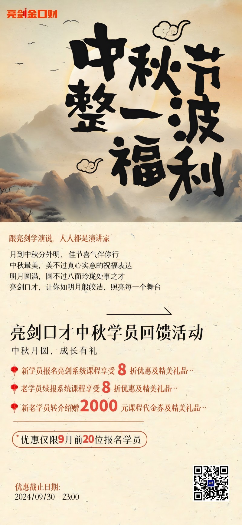中秋最美,美不过真心实意的祝福表达;明月圆满,圆不过八面玲珑处事之才。亮剑口才,让你如明月般皎洁,照亮每一个舞台