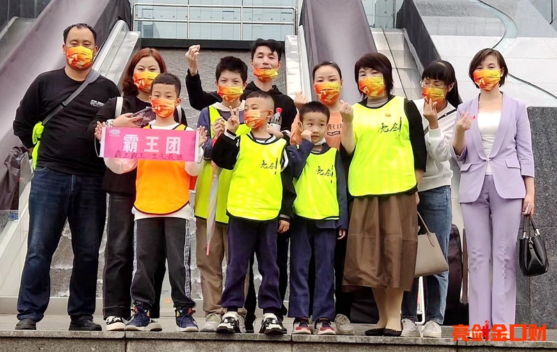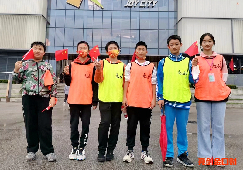 十月一日,风雨也阻挡不了亮剑人的热情,一大早,亮剑的学员们都聚集在集合地点。成人学员、青少年学员、学员家长、学员朋友、亮剑的合作伙伴们身披黄马甲、手拿小国旗,兴高采烈。