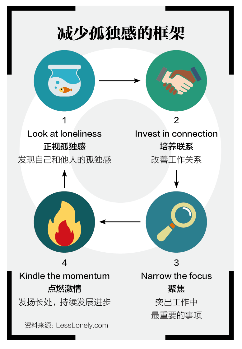 正如“减少孤独感的框架”中所推荐的四步循环法,坚持积极社交行为(如最后发言表态、均匀分配对话时间)才能有效减少孤独感。领导者还需要帮助团队聚焦重要事项,推广有效的方式方法,从而让团队形成强大的工作动力。