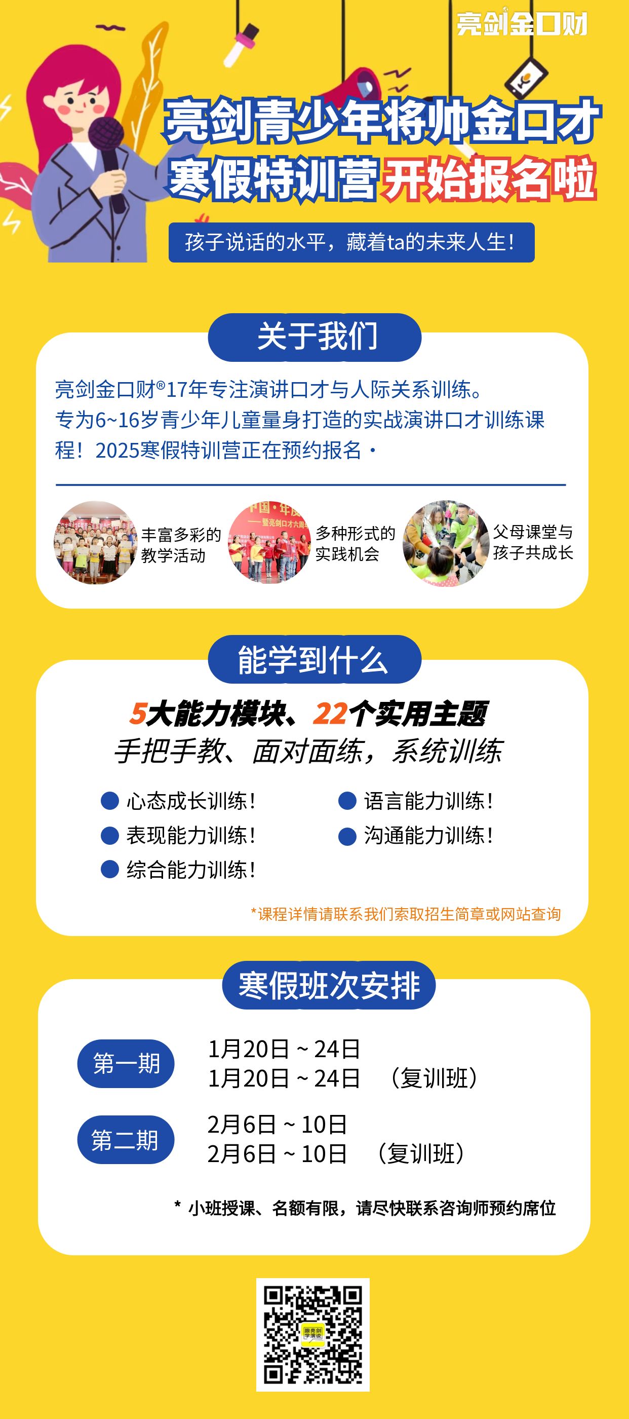 所以说,孩子的语言表达水平,决定他未来的竞争力。 练好语言表达,是最划算的事! 来《亮剑青少年演讲口才训练营》2025寒假班,给孩子一个挑战自我的机会!